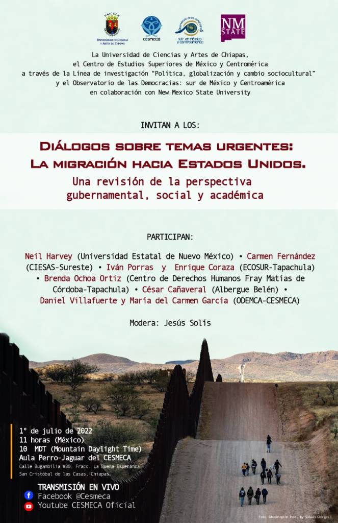 La Universidad de Ciencias y Artes de Chiapas, el Centro de Estudios Superiores de México y Centroamérica, el Observatorio de las Democracias: sur de México y Guatemala, y la New Mexico State University, invitan a la presentación Diálogos sobre temas urgentes: la migración hacia Estados Unidos. Una revisión de la perspectiva gubernamental, social y académica.