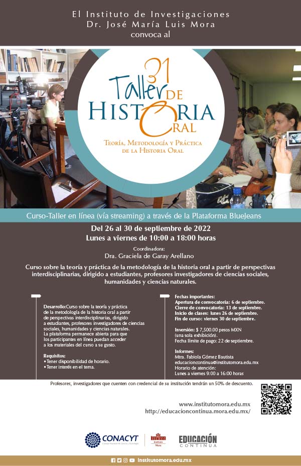 Del 26 al 30 de septiembre de 2022, se llevará a cabo la edición 31 del Taller de Historia Oral: Teoría, Metodología y Práctica. El taller es coordinado por Graciela de Garay Arellano y es parte de las actividades de Educación Continua del Instituto Mora.