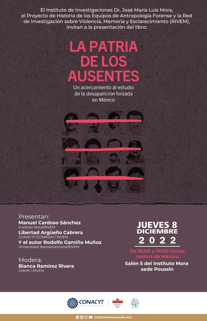 El Instituto de Investigaciones Dr. José María Luis Mora y la RIVEM, invitan a la presentación del libro La Patria de los Ausentes. Un acercamiento al estudio de la desaparición forzada en México, obra de Rodolfo Gamiño Muñoz.