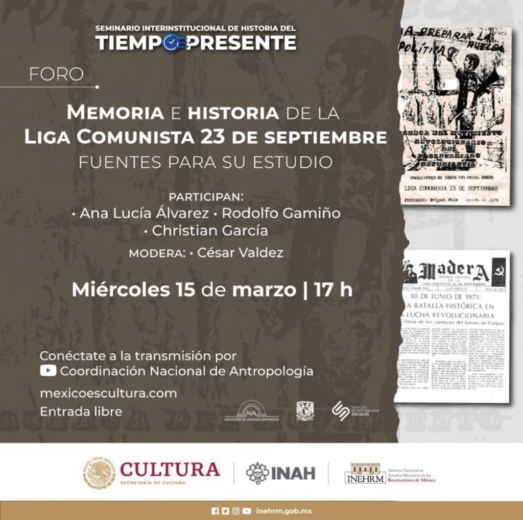 El Seminario Interinstitucional de Historia del Tiempo Presente (INAH/INEHRM) invita al foro de discusión sobre la Liga Comunista 23 de septiembre.