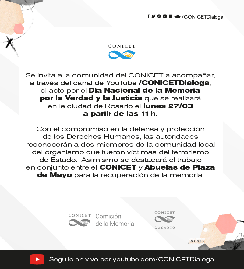 A través de CONICET Dialoga, se invita al acto por el Día Nacional de la Memoria por la Verdad y la Justicia, que se llevará a cabo en la ciudad de Rosario, Argentina, el lunes 27 de marzo de 2023, a las 11hrs. (hora de Argentina).